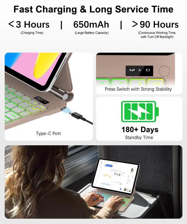 STRONG MAGNETIC ATTACHMENT: No complicated installation requirements, the super magnets can easily connect the case to the tablet seamlessly without worrying about falling. For ipad A16 case with touch keyboard feathered with 650mAh large capacity battery and USB-C port fast charging allow you to enjoy 180+ days standby time with just 3 hours of charging .