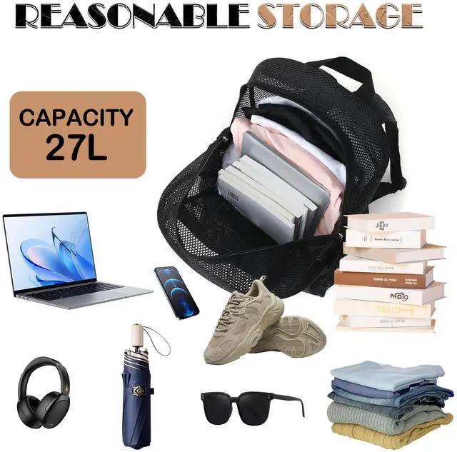 LARGE CAPACITY:Mesh backpack measures 18 x 13 x 7 inches, it features a 27L main compartment and an inner laptop pocket, suitable for 17inches or less in laptops and school supplies. Two front zippered pockets are convenient for storing small items separately. Two side pockets are perfect for carrying umbrellas and water bottles.