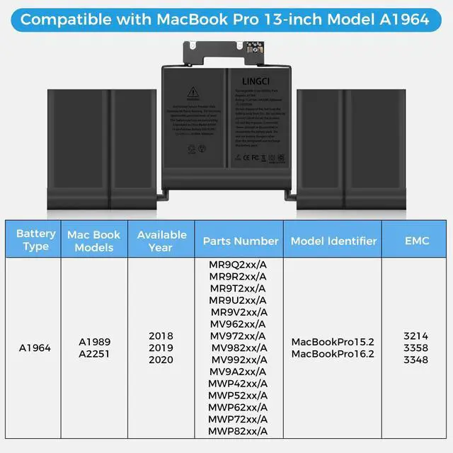Compatible Laptop ModelsA1964 Battery for MacBook Pro 13 Inch A1989(EMC 3214)(Mid 2018) and A1989(EMC 3358)(Mid 2019) and A2251(2020 Release), MR9Q2LL/A MR9R2LL/A MR9T2LL/A MR9U2LL/A MR9V2LL/A MV962LL/A MV972LL/A MV982LL/A MV992LL/A MV9A2LL/A MWP72LL/A MWP82LL/A MWP42LL/A MWP52LL/A MWP62LL/A MR9Q2 MR9R2 MR9T2 MR9U2 MR9V2 MV962 MV972 MV982 MV992 MV9A2 MWP62