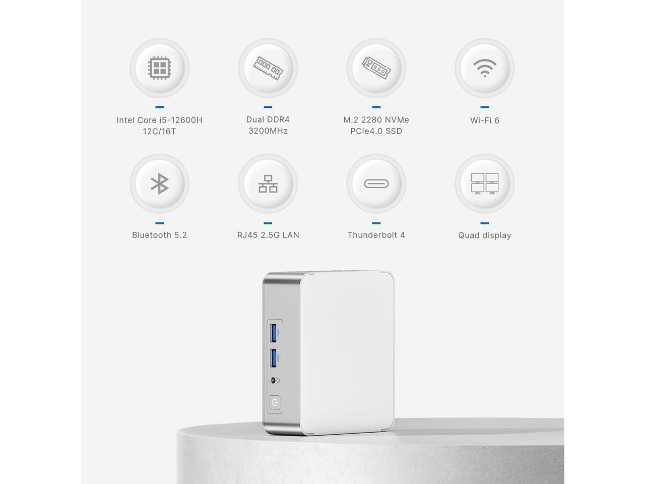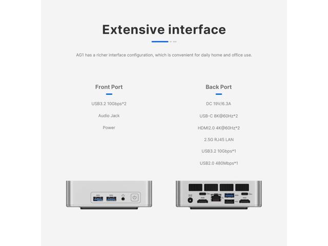 Upgraded 12th-Gen Core i5AG1 Mini PC is equipped with Core i5-12600H processor (12C/16T, 18MB Cache, up to 4.5GHz), 4P+8E hybrid architecture to achieve high performance and long endurance.Mini computers use Iris Xe, which supports dynamic frequency up to 1.40GHz. The graphics rendering ability is greatly improved, and the streaming media is played smoothly, HTPC, printer management, Zoom conferencing, etc.