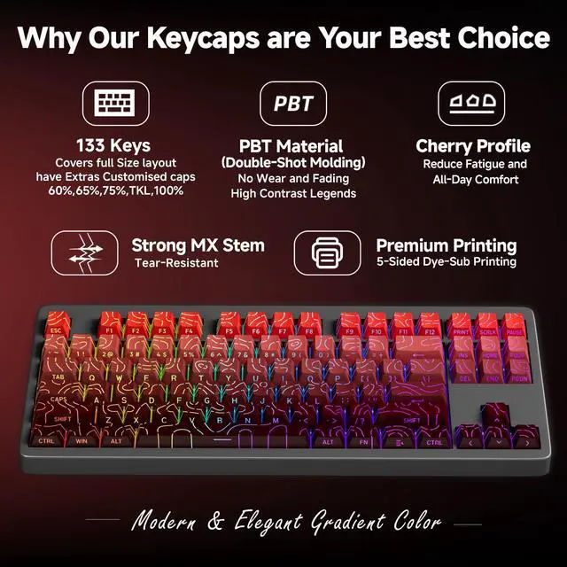 : Complete 133 PBT keycaps set featuring a smooth, modern red-to-black color transition with stunning RGB shine effect, giving your keyboard a refined and distinctive look. Fits full-size and compact layouts (100%, 75%, 65%, 60%), perfect for personalizing your mechanical keyboard