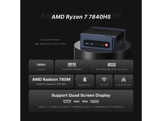 - Ryzen 7 7840HS Performance ProcessorThe BOSGAME mini pc is driven by the AMD Ryzen 7 7840HS (8-core/16-thread, up to 5.1GHz) with Radeon 780M graphics (12 CUs, 2.7GHz), delivering desktop-level power for AAA gaming, 4K video editing, 3D rendering, and live streaming. Multitask seamlessly between heavy workloads like CAD modeling and code compilation.