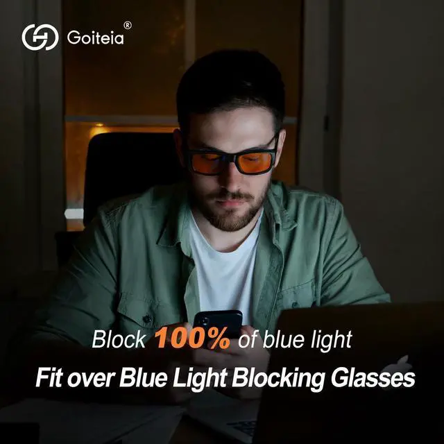 If youve ever experienced eye fatigue, headaches, or trouble falling asleep after staring at a screen all day, the Goiteia orange blue light blocking fit over glasses can help. Their unique orange tint effectively blocks 100% of blue light in the 380-500 nm wavelength range. They make it easier on your eyes, allowing you to focus better on work or gaming without feeling tired or blurry, and they can also reduce the frequency of migraines. Plus, since blue light can suppress melatonin production, wearing these amber blue light blocking over glasses can help you fall asleep faster after using electronic devices before bed.