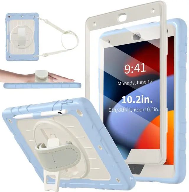Stweap Case for iPad 9th/8th/7th Generation-Built-in Screen Protector,with Pencil Holder&360°Rotating Hand Strap,Shoulder Strap,Case for iPad 10.2 inch 2021-2019(Blue/Beige)