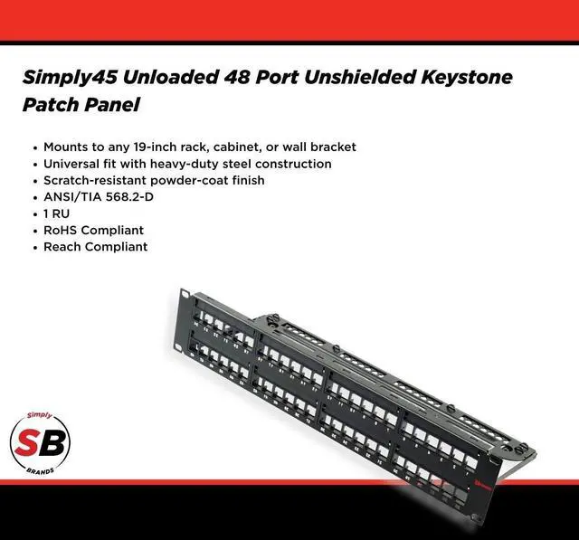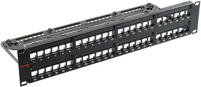 Simply45 Unloaded 48 Port Unshielded Keystone Patch Panel - Black, 2RU, Includes Cable Management Bracket, Cable Ties and Rack Screws - S45-2048U