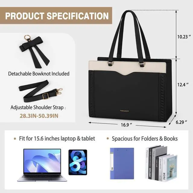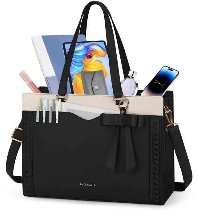 RAINSMORE Laptop Bag for Women 15.6 Inch Work Tote Bag with Detachable Strap & Bow Leather Professional Laptop Tote with Cup Holder, Office Business Briefcase Large HandbagBlack-White