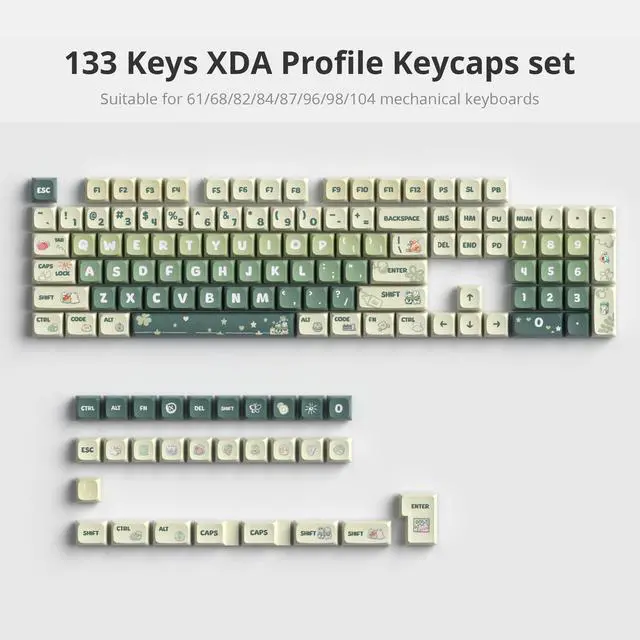 Wide CompatibilityThis keycap set can be used for most ANSI US / ISO layout mechanical keyboards and any mx switch. 133 keys can fit for 60% 65%75% 100% (61/64/68/82/84/87/96/980/104/108) mechanical keyboard.