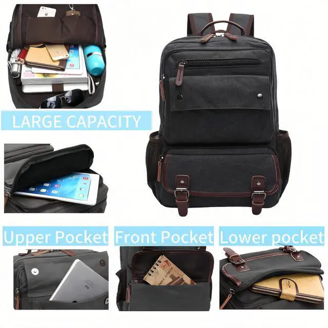 Vintage Canvas Backpack Functional and Organized Design2 front pockets, 2 side pocket, a spacious main compartment with 2 pen pockets, and a dedicated laptop compartment suitable for laptops up to 15.6 inches in size.