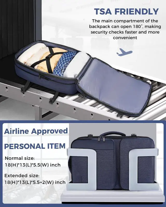 As Personal Item Airline Approved: Say goodbye to extra luggage fees! Sized at 18" (H) × 13" (L) × 5.5" (W) (expandable to 7.5"depth), this Expandable Travel Backpack fits the personal item limits of most major airlines such as for Spirit, Frontier, JetBlue, and Southwest. Easily slides under the seat or into overhead bins. The TSA-friendly 90180° opening design speeds up security checks and keeps your items neat. Travel lighter, faster, and smarteryour optimal carry-on solution