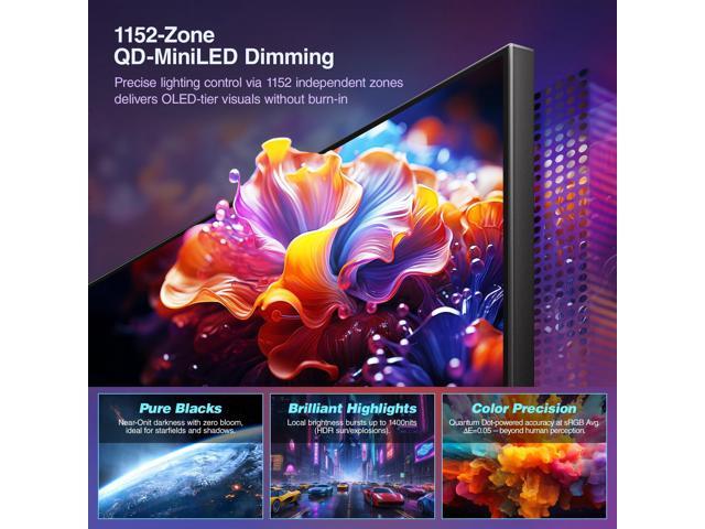 - Stunning Visual Fidelity1152-Zone Mini LED & 4K UHD "Experience cinematic clarity with 1152 individually controlled Mini LED zones and 3840×2160 resolution. 300,000:1 static contrast and VESA DisplayHDR 1400 certification deliver deepest blacks and dazzling highlights every detail perfected