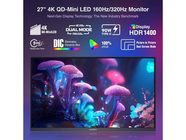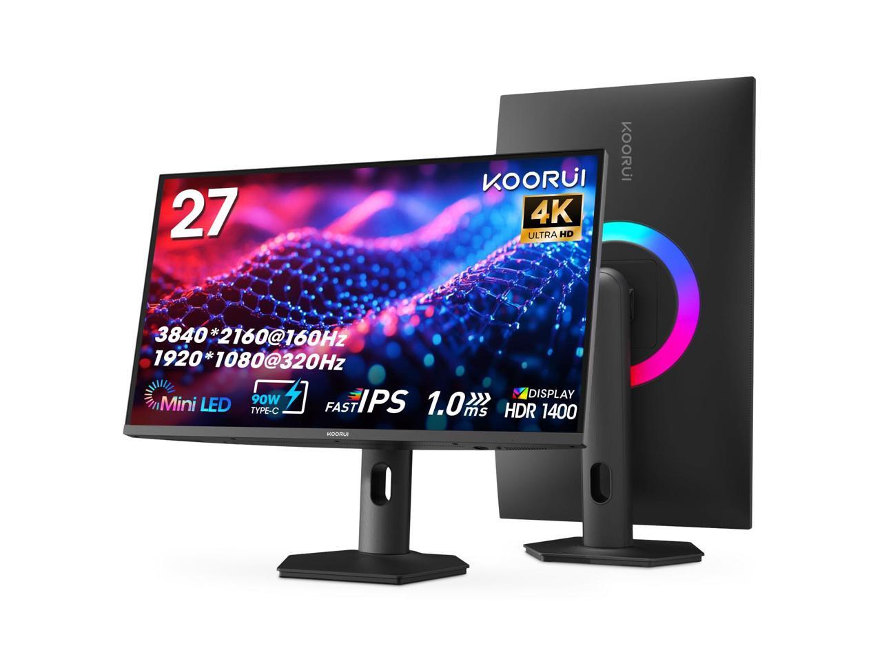 KOORUI 27" 4K QD-Mini LED Gaming Monitor - Dual-Mode (UHD 160Hz or FHD 320Hz), 0.5ms, 99% Adobe RGB, HDR1400, 90W USB-C, HDMI 2.1/DP1.4, VESA, Tilt Height Swivel Vertical Adjustment, Black, S2741LM