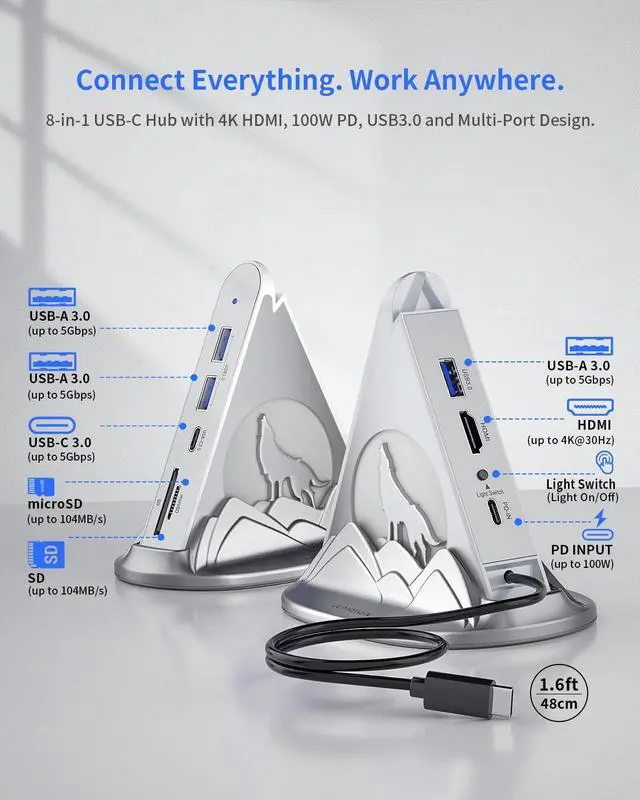 8-in-1 USB-C Hub Multiport Adapter:Tired of constantly running out of ports? This compact vertical 8-in-1 USB-C dock expands your laptops connectivity with ease. Equipped with 1 HDMI port, 3 USB-A ports, 1 USB-C charging port (100W PD), and dedicated SD/microSD card readersits compatible with MacBook Air, iPad Pro, iPhone, HP, Dell, Samsung, and more.