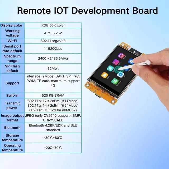 REMOTE IOT DEVELOPMENT BOARD: Real lnternet of Things development tool with a controllable display screen. The display screen is highly customizable and can be used to control various APP remote controls, collect environmental data, and provide remote control. Furthermore, it is compatible with data fusion, setting remote parameters, and a variety of other batch development applications.