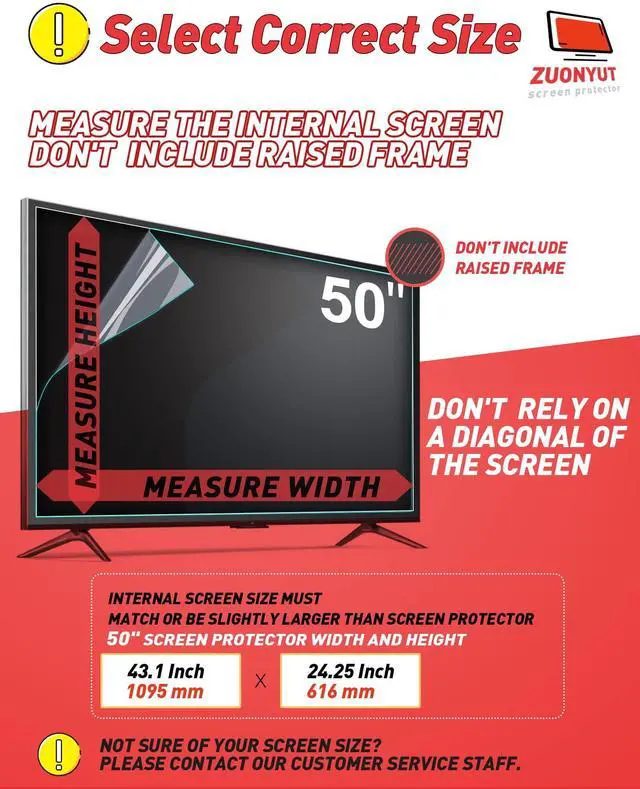 50 inch TV glare stopper Size match: 50" (W43.1in H24.25in). Please measure the internal screen of the TV and compare it with the size chart to make sure the size matches before purchasing. Accurate measurement of your TV's internal screen size is critical to ensure proper fit.