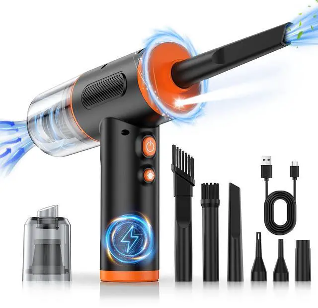 Compressed Air Duster and Vacuum, PumpNot only a compressed air duster, but also a handheld car vacuum for keyboard or cars, frames that is compact, lightweight and easy to use. Freely switch to compressed air duster or car vacuum cleaner mode according to your needs, easily removes dirt, debris, dust, pet hair, and deeply embedded dirt, also blow up swimming rings or blowing BBQ charcoal etc.