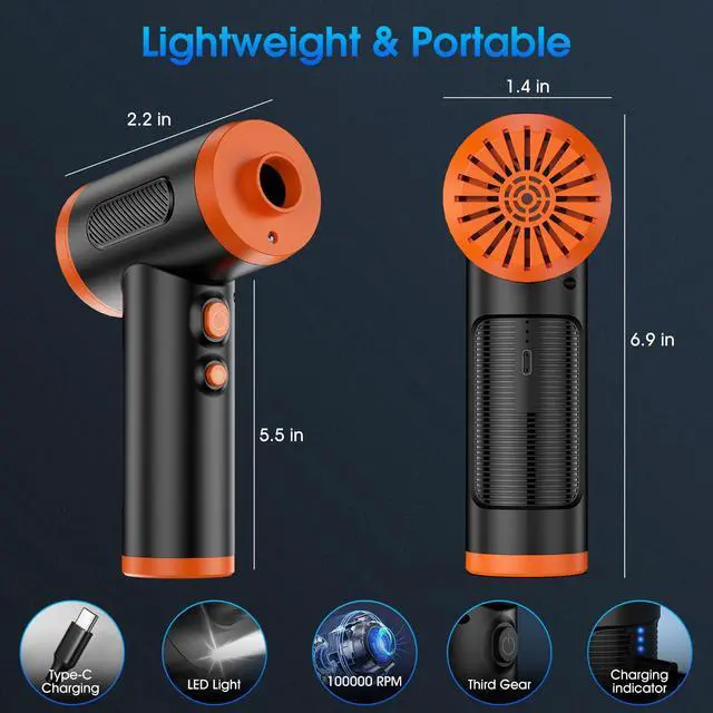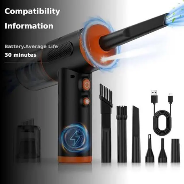 Rechargeable and ConvenientWith superb power storage capacity, this mini electric compressed air blower can run continuously for 30-40 minutes on a single charge. It comes with a USB-C fast charging cable and can be charge