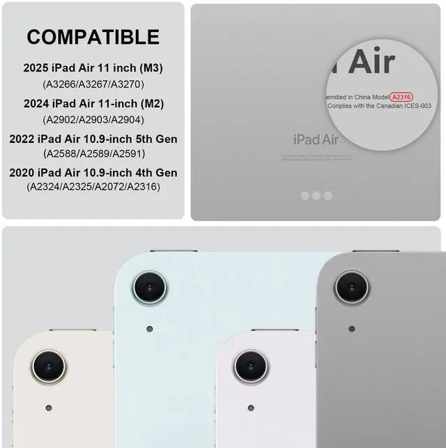 Compatibility ModelThis air keyboard case is designed for iPad Air 7th/6th 11 inch M3/M2 (2025/2024), (Model: A3266/A3267/A3270/A2902/A2903/A2904), for iPad Air 5th Generation 10.9 inch 2022 (Model: A2588/A2589/A2591), for iPad Air 4th Generation 10.9 inch 2020 (Model: A2072/A2316/A2324/A2325). NOT compatible with any other iPad models.Please check the back bottom of your iPad carefully to find the Model Number before purchase