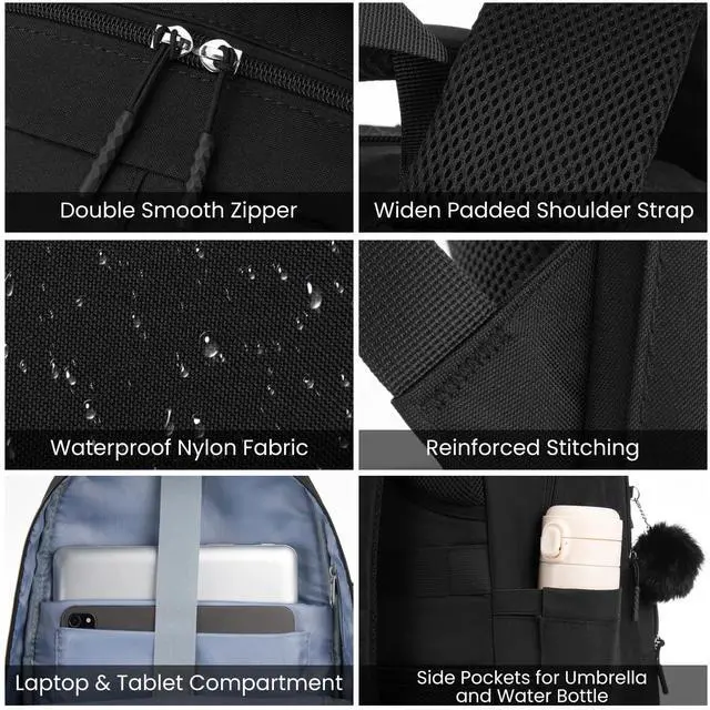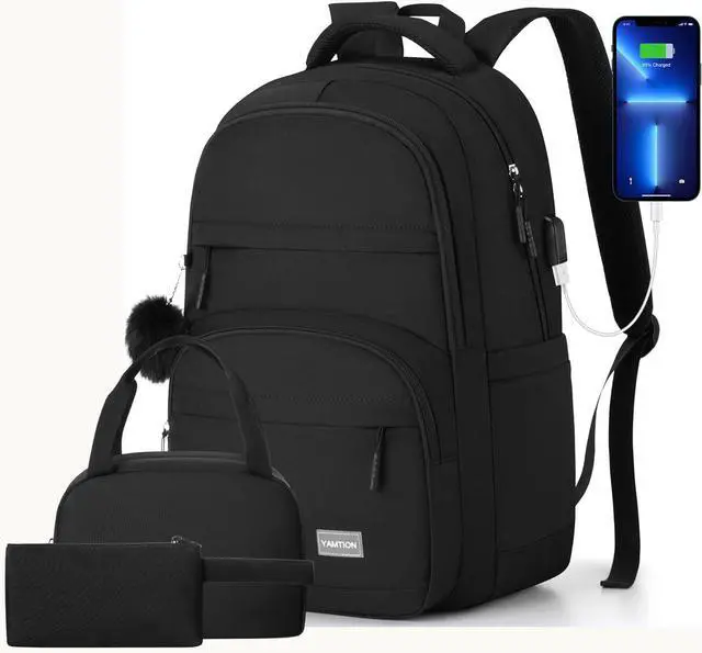 YAMTION Black School Backpack Set for Women, High School Bookbag for Girls Middle School Bags for Kids with Charger Ports for College Work
