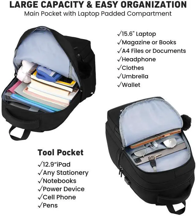 • Large Size & Gift: The size of the back pack is 17.79x11.66x6.32in, Weight:1.6 LB. The 15.6" padded laptop compartment with a tablet slot fits 12.9 inch iPad. This women book bag also along with fluffy ball key pendant as gift makes the bags more fashionable and unique.And the lunch bag and pencil pouch match perfectly for your child's daily use.