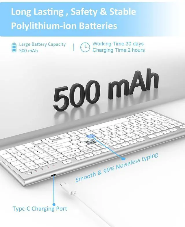 FENIFOX Wireless Keyboard, Bluetooth + USB Ergonomic Silent Quiet Rechargeable with Number Pad Compact Full Size Multi Device Keyboards for iPad Tablet Mac Computer Surface PC MacBook Laptop Silver