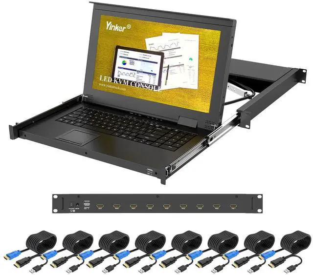 Yinker 8 Port Rack Mount LCD KVM w/ 15.6 inch Monitor, HDMI LCD KVM Console for 1U 19'' Rack 600-800mm Network Server Cabinet + Keyboard TouchPad + 8 Pack Cables