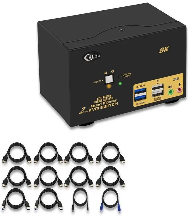 CKLau 2 Port USB 3.0 Quad Monitor KVM Switch HDMI 2.1 8K@60Hz 4K@144Hz with Audio Output and All Input Cable, 2 PCs 4 Monitors Video Keyboard Mouse Peripheral Sharing Switcher