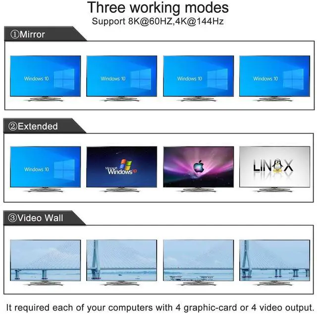 3. Quad Monitors KVM Switch USB 3.0: Support wired/wireless/unify keyboard and mouse, Apple keyboard (hot key is changeable), touch screen, OLED screen, 16:9 widescreen, 21:9 ultra-wide monitors, etc.