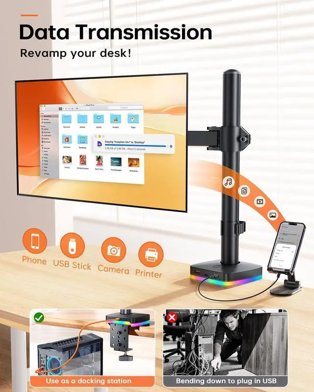 [Multifunctional Data Transmission Interface]: The RGB box under this monitor stand has two USB-C ports and two USB ports allow for easy connection of peripherals such as keyboards, mice, headphones, cameras, USB flash drives, mobile data cables, and more, eliminating the need to frequently bend down to plug and unplug the host
