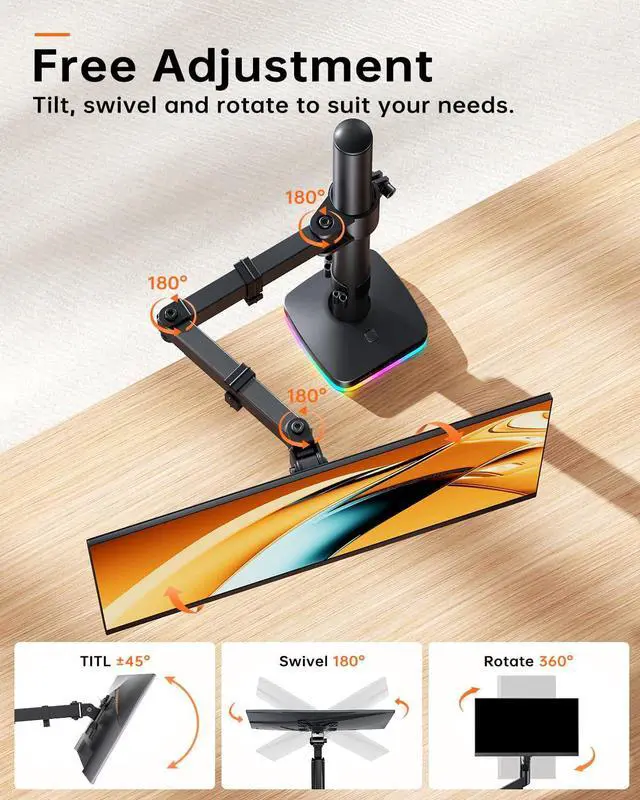 RGB Single Monitor Stand, Fully Adjustable Monitor Desk Mount Sturdy Stepped Arm Design up to 17.6 lbs Desk Mount withRGB USB & USB-C High Speed Data Transfer C-Clamp 75x75/100x100 VESA