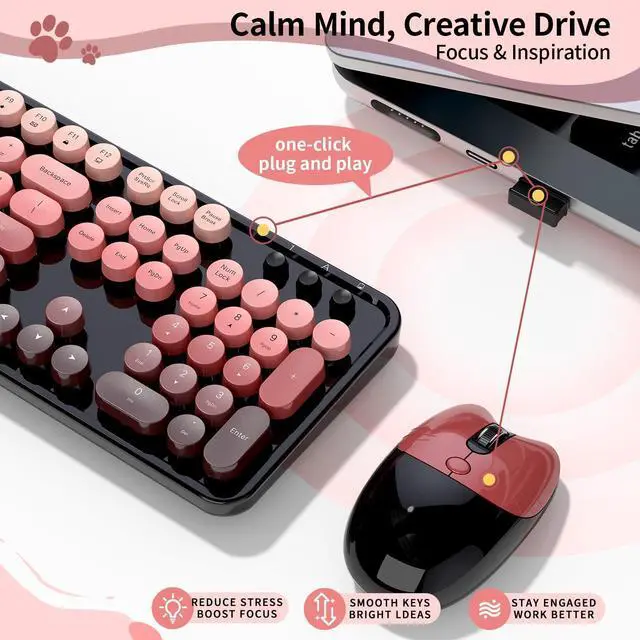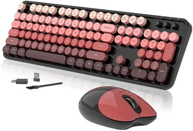 Retro Floating Round Keycapscolorful keyboard and mouse wireless with vintage typewriter-inspired retro floating rounded keycaps, gives you the most comfortable typing experience and adds some much needed spunk to your desk.The crisp key sound takes you back to the industrial era, and the independent round keycaps facilitate finger positioning. The floating keys under your fingertips are comfortable and skin-friendly