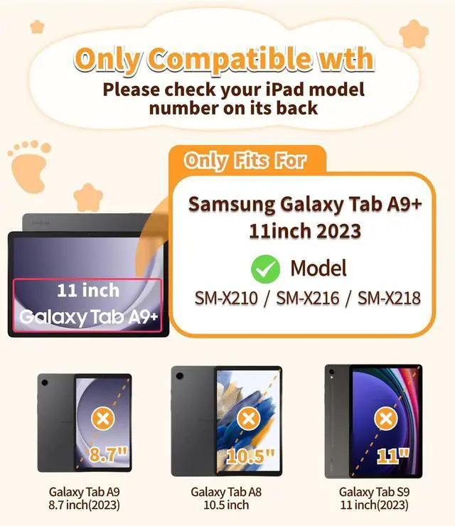 CompatibleThis case is only compatible with Samsung Galaxy Tab A9 Plus 11 Inch 2023. (Model includes: SM-X210 / SM-X216 / SM-X218).check model numbers before purchase for a perfect fit. Note: It does not fit other models.