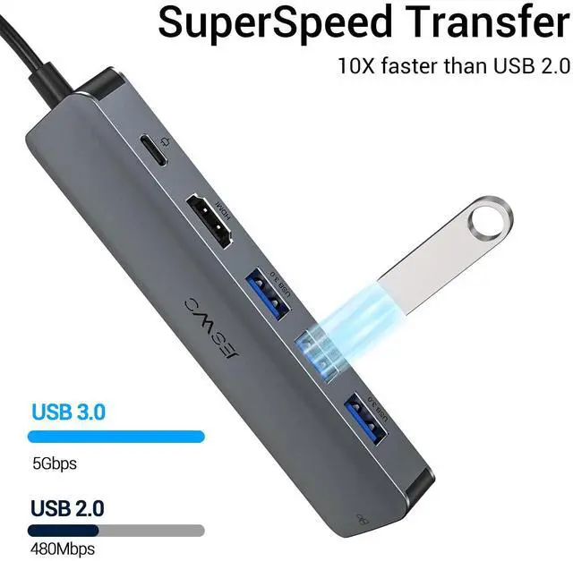USB C Hub Multiport AdapterWith JESWO 6-IN-1 USB C Hub, easily expand your laptop from a USB C port into 6 ports, you get 1*4K HDMI port, 1*1000Mbps Gigabit Ethernet port, 3*USB 3.0 ports, 1*100W Type C Power Delivery Port