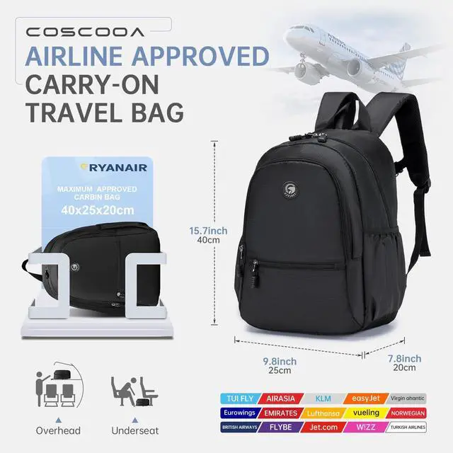 Airline Approved Personal Item Travel BackpackThe size of the COSCOOA Travel backpack corresponds exactly to the maximum size that can be taken in the cabin on flights with Ryanair 40x20x25cm/20L. It is approved by most airlines including Ryanair, United Airlines and Frontier Airlines. (Dimensions: 40 x 25 x 20 cm/15.7 x 9.8 x 7.9 inches; Weight: 0.77lbs.),fit for United Airlines Personal Item Bag 17x10x9.