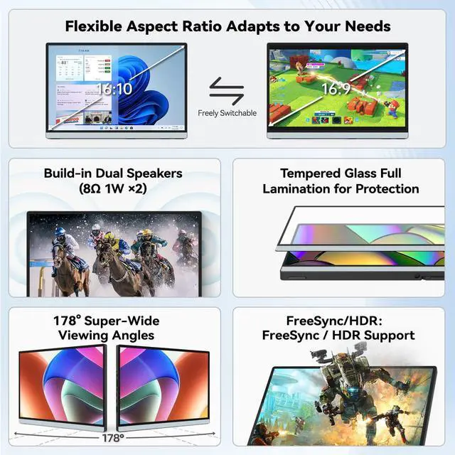 BRILLIANT WUXGA PORTABLE DISPLAY: This 14 inch portable monitor features an IPS screen with 1920x1200 resolution (1200P) in a productive 16:10 format, giving you more vertical space for work and reading. With 72% sRGB color gamut, HDR support, and FreeSync, this portable screen delivers vibrant colors, sharp contrast (1000:1), and smooth visuals ideal for creative tasks, streaming, and gaming