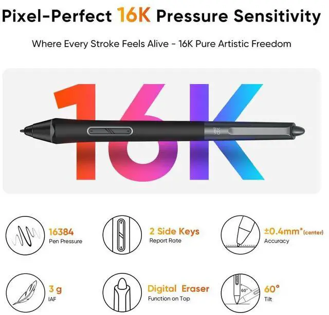 Pixel-Perfect 16K Pressure SensitivityIndustry-leading 16,384 pressure levels with ±60° tilt recognition mimic real brush strokes. The X3 Pro chip stylus (90ms latency) delivers true-to-life precision for anime or calligraphy, making it a premium digital art tablet. Includes 8 replacement nibs for graphics tablet artists