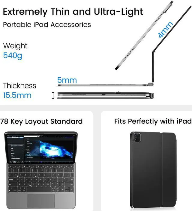 Work anywhere, anytime- Turn iPad air into a Mini Macbook, upgrade to laptop mode. This iPad air 11 keyboard case has strong portability, thin and light body, the whole weight is only 540g. make the work anywhere can be done easily.