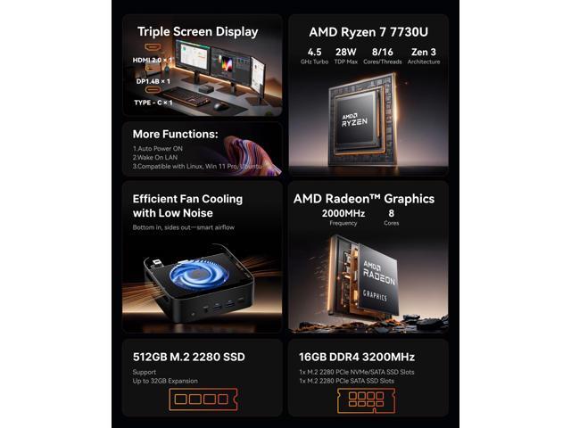 - [UNLEASH OFFICE POTENTIAL WITH RYZEN 7 7730U] - Powered by an AMD Ryzen 7 7730U processor, this Kron Mini K1 is small but mightyready to tackle any challenge! Thanks to AMD Simultaneous Multithreading the core-count is effectively doubled, to 16 threads. Ryzen 7 7730U has 16 MB of L3 cache and operates at 2000 MHz by default, but can boost up to 4.5 GHz, depending on the workload