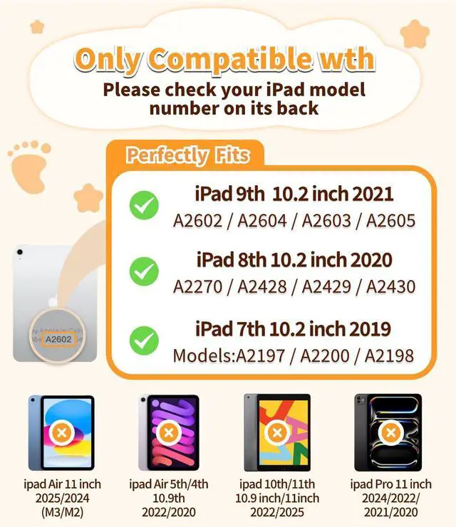 CompatibleThe cute case is ONLY compatible with iPad 9/8/7th Generation. (Model includes: A2602 / A2604 / A2603 / A2605 /A2270 / A2428 / A2429 / A2430/A2197 / A2200 / A2198 ).check model numbers before purchase for a perfect fit.