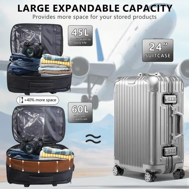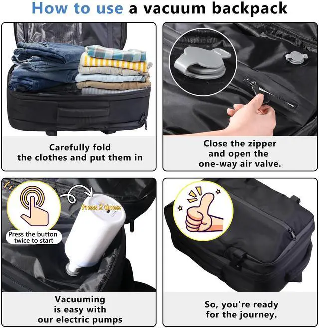 Vacuum Compression: This vacuum backpack uses a vacuum compression design, travel backpack can save a lot of space to store more items. You can release the air manually or use a vacuum pump to quickly compress,laptop backpack can maximize packing efficiency, carry on bag reducing space waste and maximizing packing capacity.