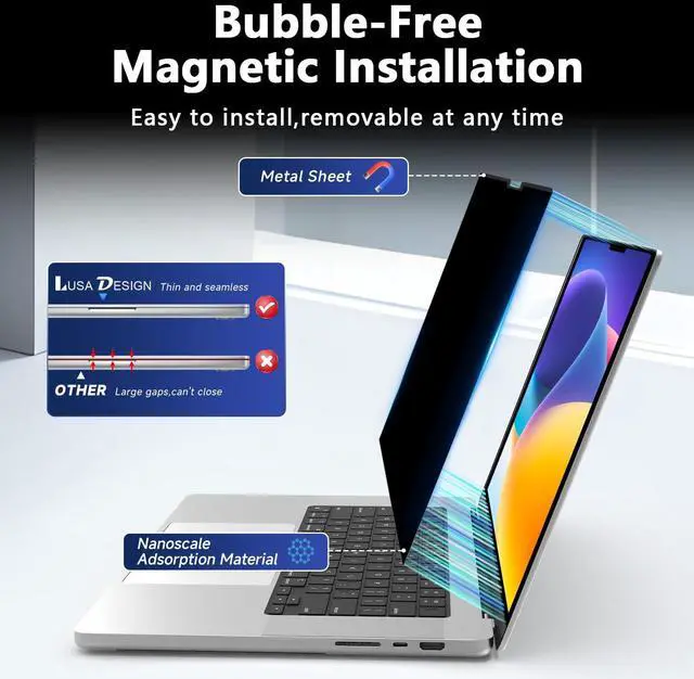 One-Second Magnetic Attachment- LUSA DESIGN privacy screen MacBook Air 15 Inch simply places the privacy screen along the top of your MacBook and lets the magnets attach along the top. There's no complicated placement, visibly messy tape, or damaging adhesives. Not only is it easy to remove, but it doesn't damage the screen in any way. We included a storage clip, when not in use place it in the storage clip to prevent scratches and lost.