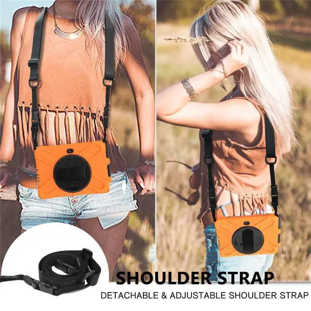 [Swivel Kickstand] The adjustable shoulder strap is great for entertaining on a car trip, plane ride even outdoor activities. You can carry the tablet around to wherever or hung it on the car headrest for back-seat passenger's entertainment.