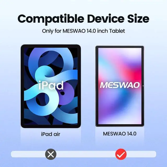 Compact Device Size: Please check your tablet model first, not fit for ipad and powmus 14 inch tablet or any other tablet. Only compatiable with MESWAO android tablet 14 inch. Just kindly check your tablet model before purchase.