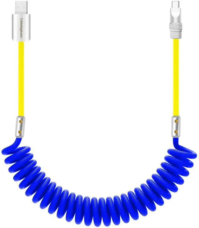 chubbycable Curly Chubby 120W Coiled USB C Cable Retractable Fast Charging Cable for Car Charger Cord Compatible with iPhone 17-15 Series, Dark Blue and Yellow, USB-A to Type-C, 2.29FT-3.6FT