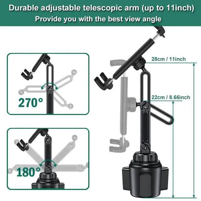 Upgraded Adjustable Expandable Long Arm: This new car cup tablet mobile phone stand for in-vehicle cup holders adapts an expandable neck for height adjustment. This cup tablet holder can be freely expanded and contracted from 8.66 to 11 inch (22~28cm) in length. A joint arm for easy 270 degree adjustment and a flexible ball joint for a 360 degree rotation design can provide the best viewing angle.