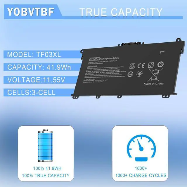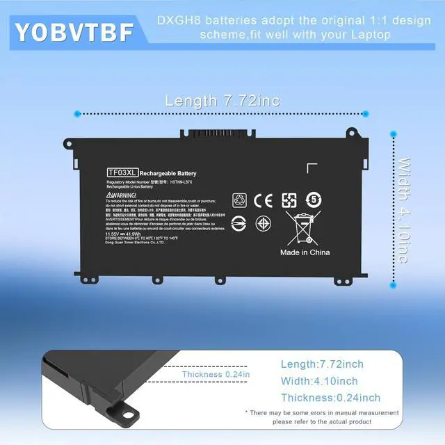 SpecificationVoltage: 11.55V Capacity:41.9WH; Cells: 3-cell; Color: Black,What you get : 1 * TF03XL Laptop Battery + 1 * User Manual + 2 * Free Screwdrivers for easy installation.