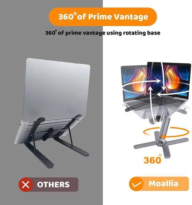 ° Featuring a 360°rotatable axis connecting with the base, Moallia rotating laptop stand for desk allows you to easily share your screen with someone sitting across the room or at another desk. It also works great for ideas sessions when collaborating with others over video chat or calls.