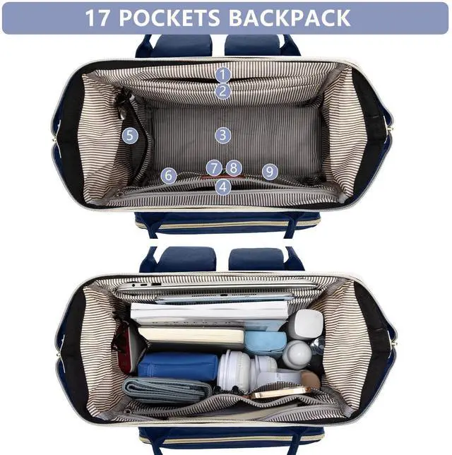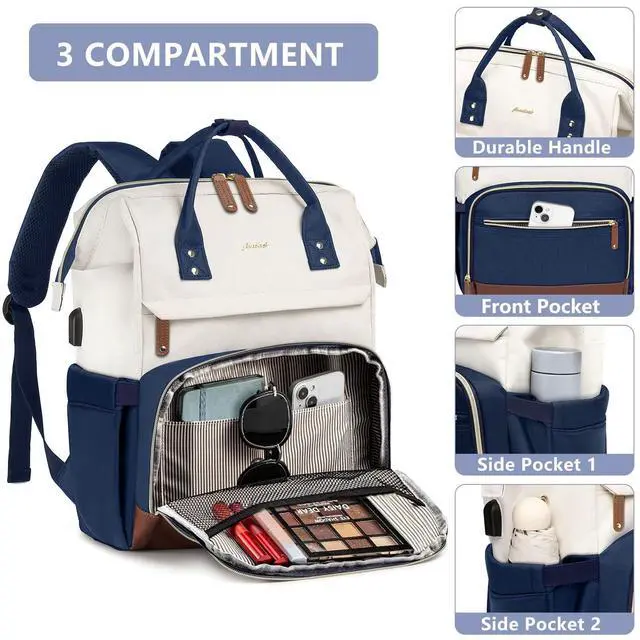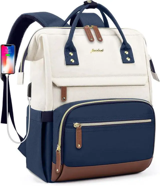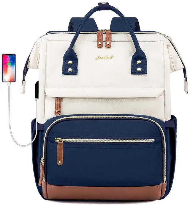 Focdod Laptop Backpack for Womem Work Bags: 15.6 Inch Travel BackPacks Durable Back Pack With USB Charging Port Anti Theft Fashion College BookBag Purse Bussiness Daypack for Nurse Teacher Navy Beige