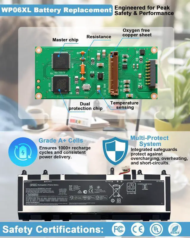 Specifications: Model Name: WP06XL standard Rechargeable Li-ion Battery; Battery Type: Lithium_ion; Voltage: 11.58 V; Capacity: 76 Wh 6304 mAh. Color: Black. Packages includes:1x WP06XL Laptop Battery, 2 x Screwdrivers for easy installation, 1x Instruction