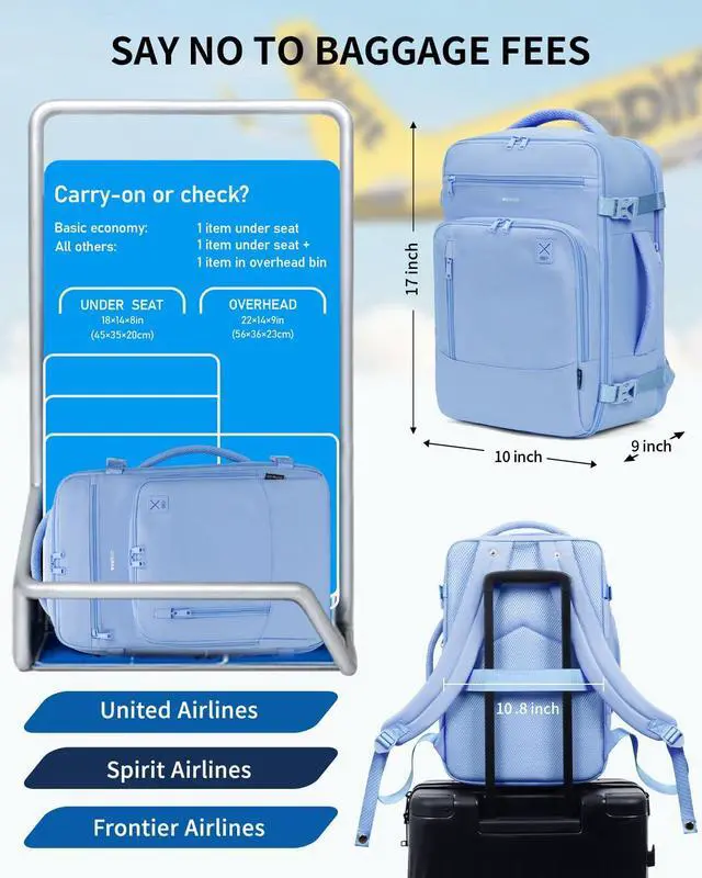 SAY NO TO BAGGAGE FEES: The ECOHUB 25L Carry On Bag is perfectly sized to meet United Airlines' personal item requirements. Measuring 17" x 10" x 9" and weighing just 1.6 lbs, it fits neatly under the seat. Its also compatible with Spirit, Frontier, EasyJet and many other airlines. (Patent Pending)