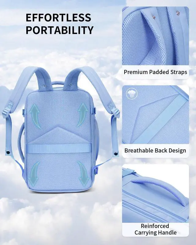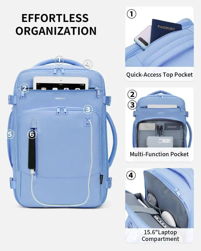 ECOHUB 17" Small Travel Backpack, United Airlines Personal Item Bag 17x10x9 with 16 Pockets, Water Resistant Rucksacks Fit 15.6" Laptop, AirTag Pocket, Lightweight Casual Daypack, 25L, Light Blue